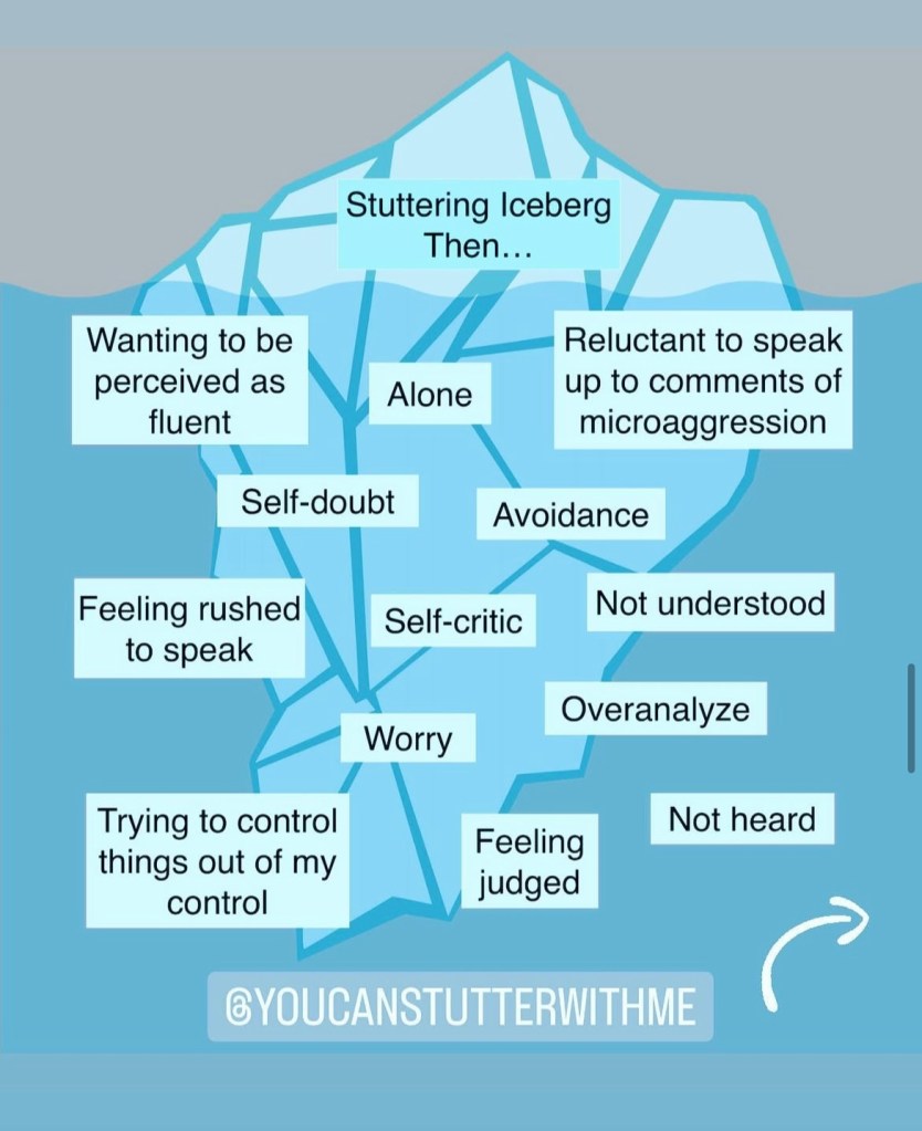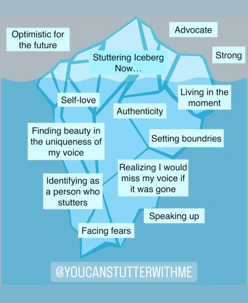 Recently I have seen some amazing reframed icebergs to show the shift in mindset and acceptance of stuttering. Thanks @ninagcomedian for the inspiration and her visual (from her book Stutterer Interrupted: